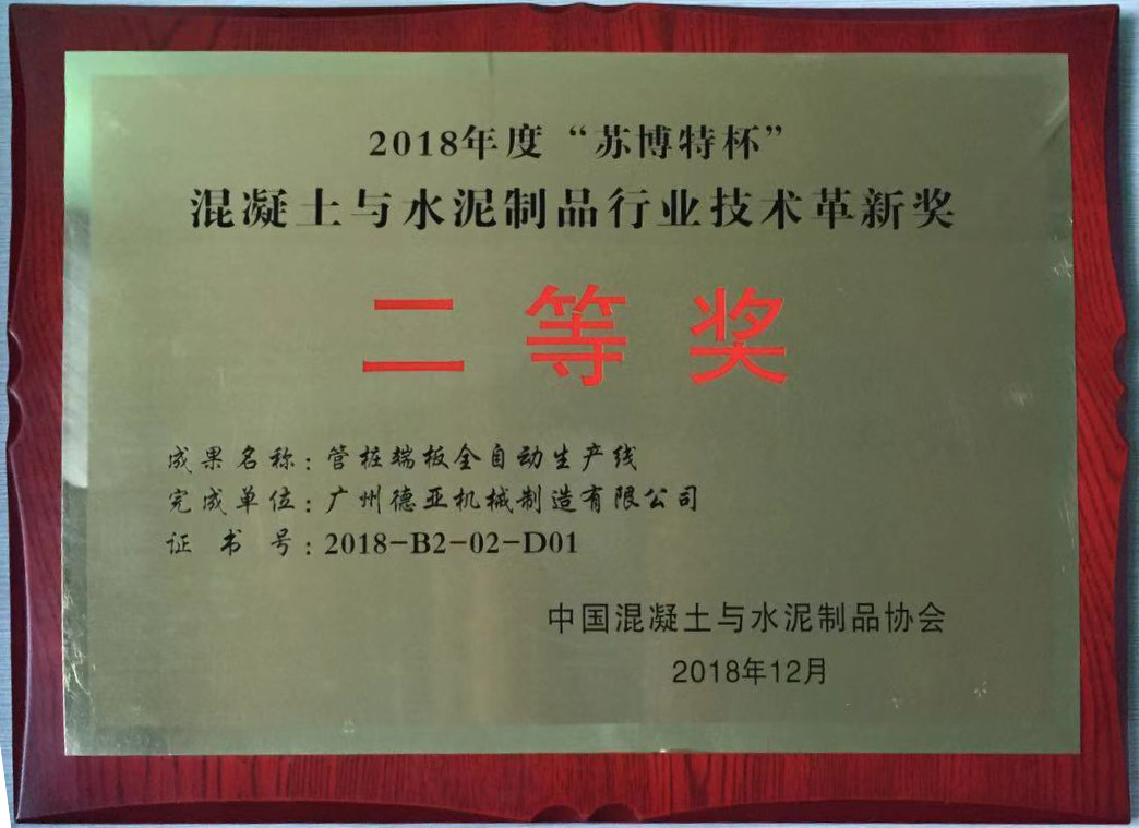 2018年12月1日,湖南長(zhǎng)沙,本年度“中國混凝土與水泥制品行業(yè)大會(huì)”隆重召開,在會(huì)前表彰大會(huì)上,我公司獨(dú)立研發(fā)的“管樁端板全自動(dòng)生產(chǎn)線”榮獲“蘇博特杯”技術(shù)開發(fā)類二等獎(jiǎng)。代表著德亞創(chuàng)智人不斷努力,為行業(yè)智能裝備產(chǎn)業(yè)升級(jí)做出的貢獻(xiàn)得到了行業(yè)協(xié)會(huì)的高度認(rèn)同與鼓勵(lì)。