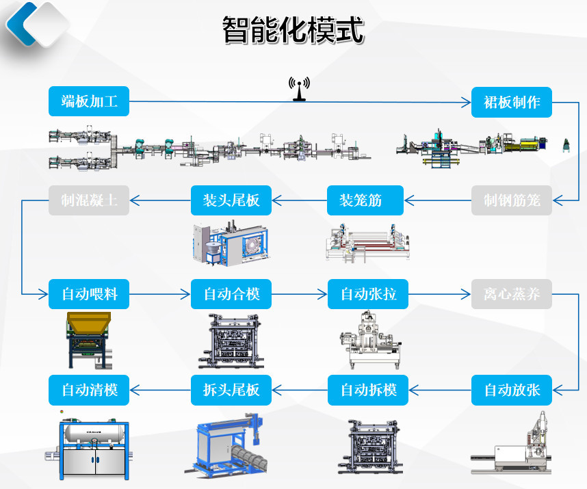 預(yù)應(yīng)力混凝土智能生產(chǎn)線應(yīng)用于建筑行業(yè)預(yù)應(yīng)力混凝土管樁的生產(chǎn),由全自動(dòng)喂料機(jī)、全自動(dòng)合模機(jī)、全自動(dòng)張拉機(jī)、全自動(dòng)拆模機(jī)、全自動(dòng)清模機(jī)、全自動(dòng)裝頭尾板機(jī)、全自動(dòng)裝籠機(jī)等設(shè)備組成,各設(shè)備具有識(shí)別不同型號(hào)的管樁規(guī)格,并自動(dòng)調(diào)整相應(yīng)的位置及技術(shù)參數(shù),獨(dú)立完成該工序的工藝操作要求。