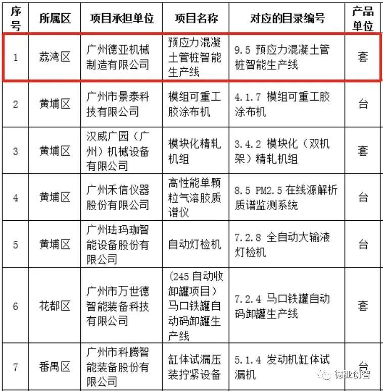 2022年,由廣州市工業(yè)和信息化局主辦,根據(jù)《廣州市工業(yè)和信息化局關(guān)于發(fā)布2022年廣州市促進(jìn)工業(yè)和信息化產(chǎn)業(yè)高質(zhì)量發(fā)展資金項(xiàng)目入庫(kù)申報(bào)指南的通知》(穗工信函〔2022〕15號(hào))要求,通過(guò)層層評(píng)選,緊張角逐,優(yōu)中選優(yōu),《2022年廣州市促進(jìn)工業(yè)和信息化產(chǎn)業(yè)高質(zhì)量發(fā)展資金首臺(tái)(套)重點(diǎn)技術(shù)裝備推廣獎(jiǎng)勵(lì)》方向項(xiàng)目評(píng)審結(jié)果已揭曉。共10家企業(yè)的創(chuàng)新項(xiàng)目入圍,廣州德亞機(jī)械制造有限公司預(yù)應(yīng)力混凝土管樁智能生產(chǎn)線成功入選榜單。