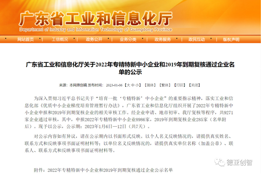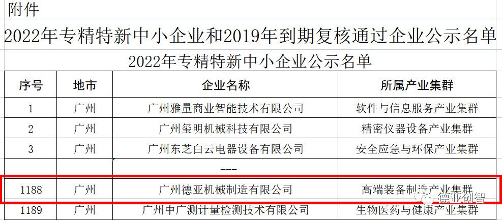 近日,廣東省工業(yè)和信息化廳公示了2022年專精特新中小企業(yè)名單,經(jīng)過嚴(yán)格的審查和嚴(yán)謹(jǐn)?shù)馁Y質(zhì)核定,廣州德亞機(jī)械制造有限公司成功入選,這是德亞發(fā)展過程中又一個(gè)重要的里程碑。