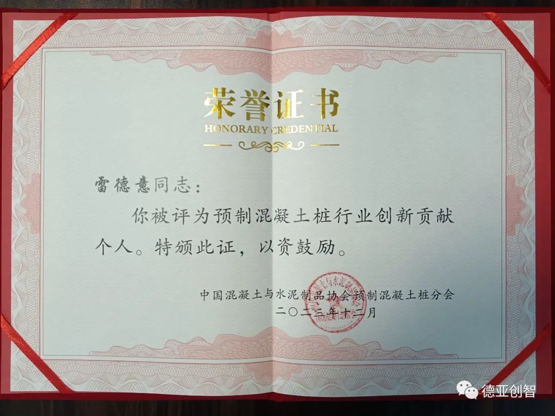 感謝中國水泥制品協(xié)會(huì)預(yù)制混凝土樁分會(huì)及業(yè)界對(duì)“德亞創(chuàng)智”的認(rèn)可,德亞創(chuàng)智將保持初心,砥礪奮進(jìn)!繼續(xù)堅(jiān)持以創(chuàng)新為主旋律,為PHC管樁行業(yè)的發(fā)展鍛造新一輪騰飛的引擎,努力推動(dòng)預(yù)制混凝土樁行業(yè)高質(zhì)量發(fā)展!