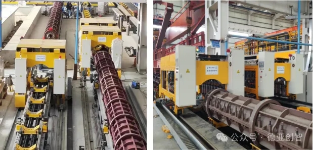 4.1 跟隨合/拆模機(jī),特點(diǎn):合/拆模機(jī)跟隨管模同步行走時(shí)合模拆模作業(yè),管模不用停止,生產(chǎn)效率高,能滿足單線模式生產(chǎn)節(jié)拍,投資成本低,目前為新工廠首選;